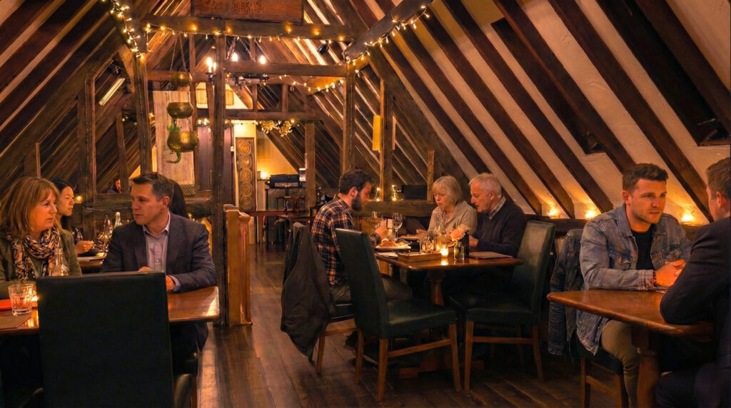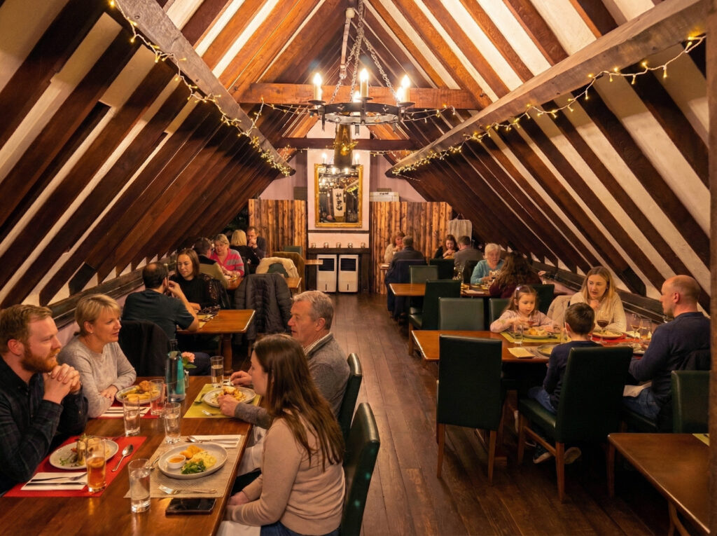 Our cosy first floor dining room is perfect for parties or meetings. Groups of up to 30 can be seated in comfort and we are very happy to offer help with menu selections, pre-ordering and seating plans.